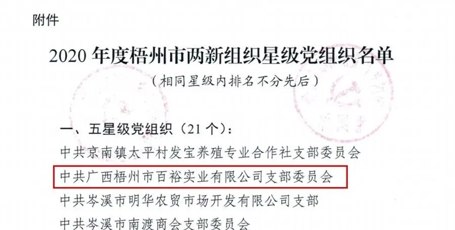 近日,中共梧州市委員會(huì)組織部印發(fā)《關(guān)于公布2020年度梧州市兩新組織星級(jí)黨組織名單的通知》,對(duì)全市109家兩新組織星級(jí)黨組織名單進(jìn)行公布,其中,百裕實(shí)業(yè)黨支部獲評(píng)“五星級(jí)黨組織”稱(chēng)號(hào),育龍黨支部獲評(píng)“四星級(jí)黨組織”稱(chēng)號(hào),百裕那蓬扶貧車(chē)間獲評(píng)“三星級(jí)黨組織”稱(chēng)號(hào)。