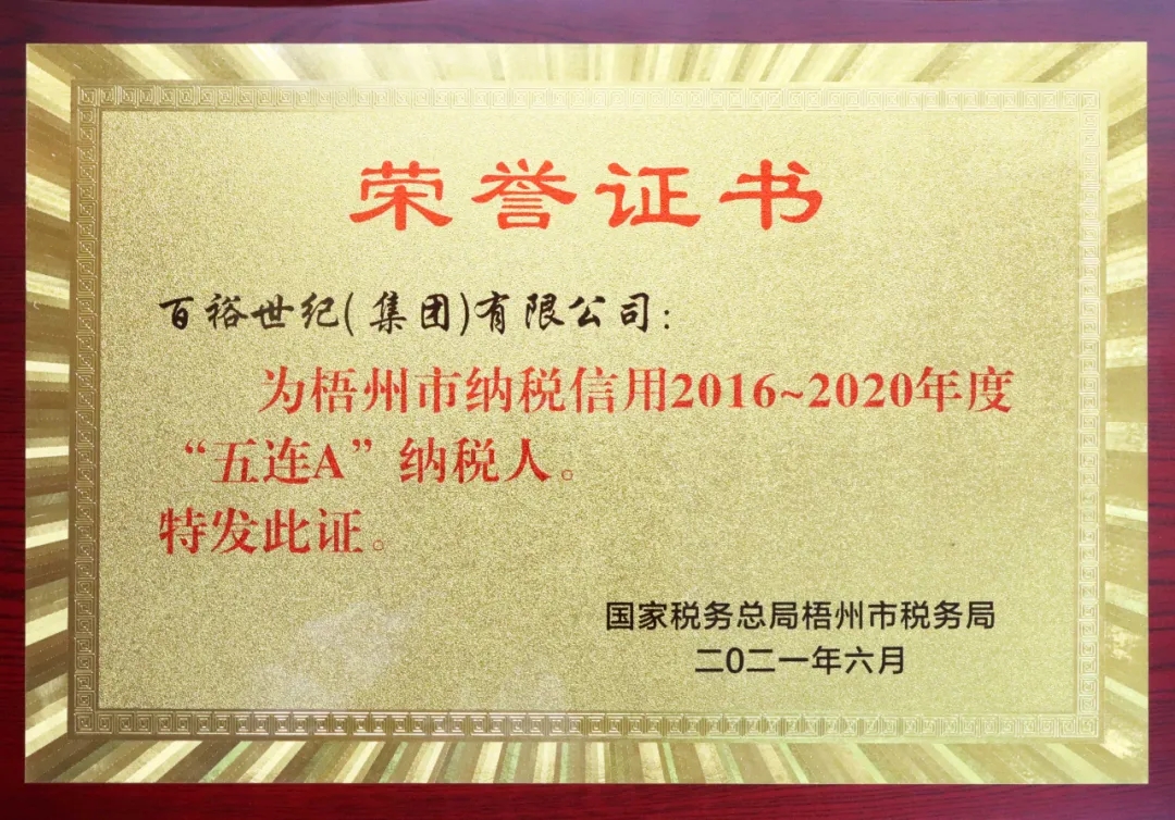 2021年6月,百裕世紀被國家稅務總局梧州市稅務局評定為梧州市納稅信用2016-2020年度“五連A”納稅人榮譽稱號,并頒發(fā)證書。
