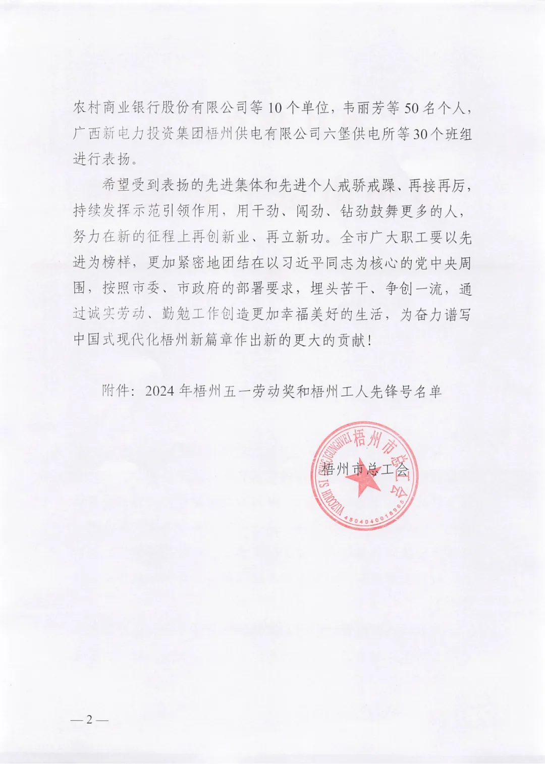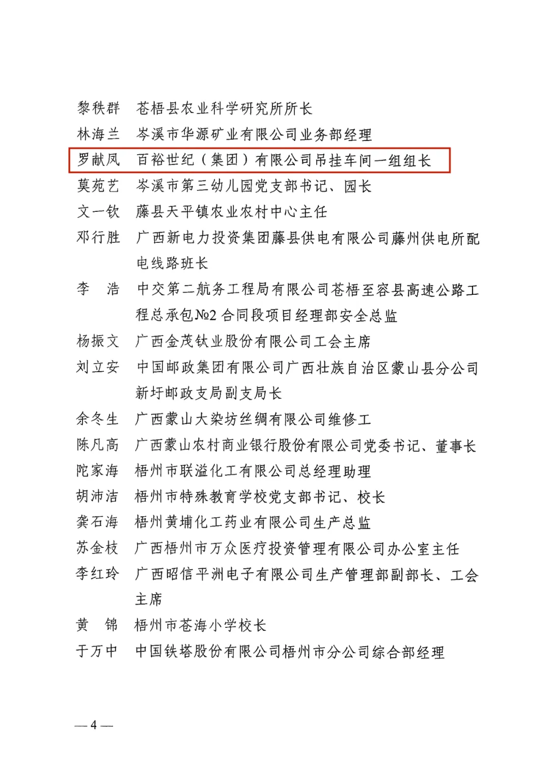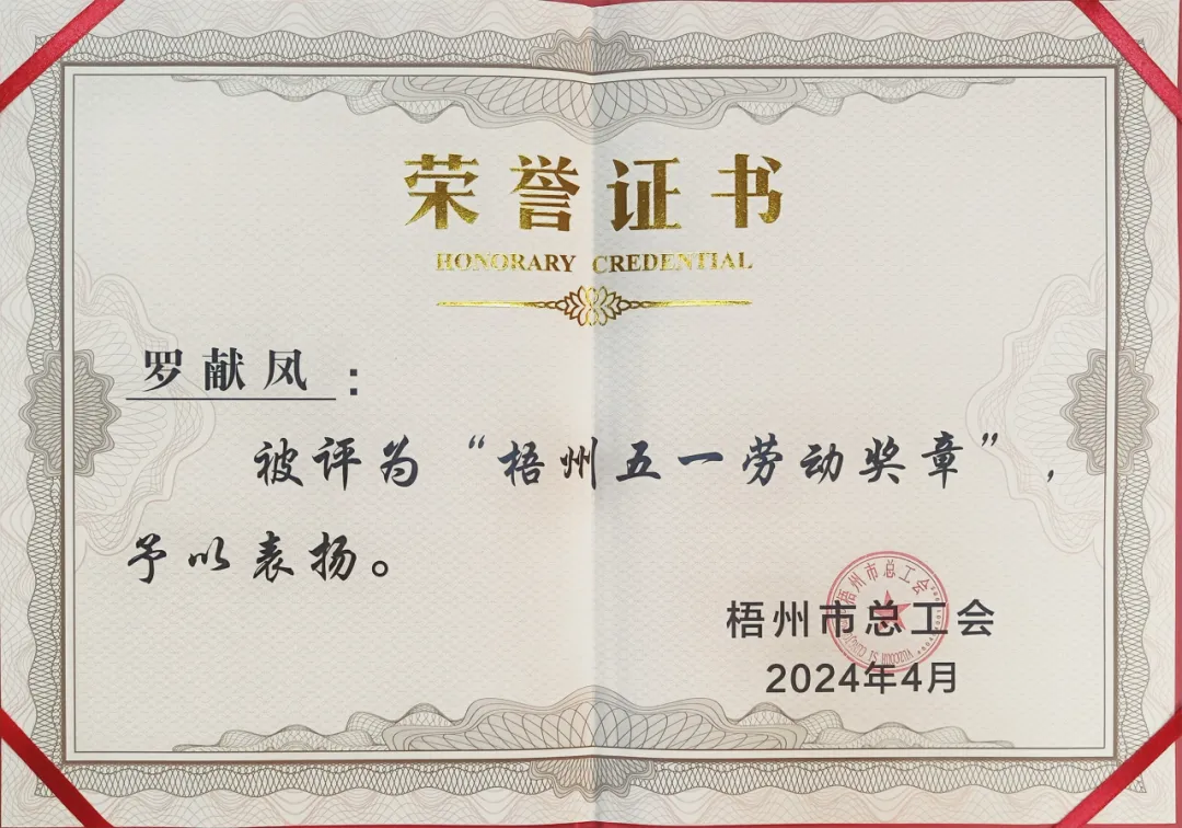 4月26日,梧州市總工會(huì)印發(fā)《梧州市總工會(huì)關(guān)于表揚(yáng)2024年梧州五一勞動(dòng)獎(jiǎng)和梧州工人先鋒號(hào)的通報(bào)》,百裕世紀(jì)(集團(tuán))有限公司羅獻(xiàn)鳳同志榮獲2024年“梧州五一勞動(dòng)獎(jiǎng)?wù)隆薄?/span>