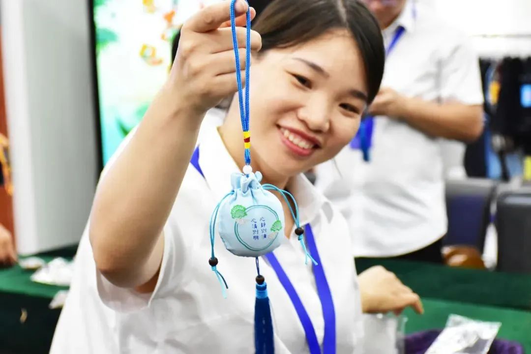 整個(gè)活動(dòng)現(xiàn)場祥和喜樂,大家熱情高漲。伴隨著歡聲笑語,活動(dòng)步入了尾聲,一個(gè)個(gè)精致的荷包出現(xiàn)在大家的手中,大家競相展示成果,分享喜悅,佩戴香囊合影留念。