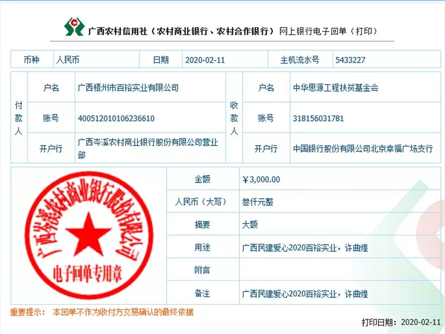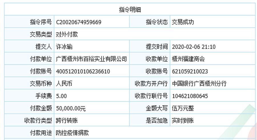 (向梧州福建商會(huì)捐款伍萬(wàn)元)