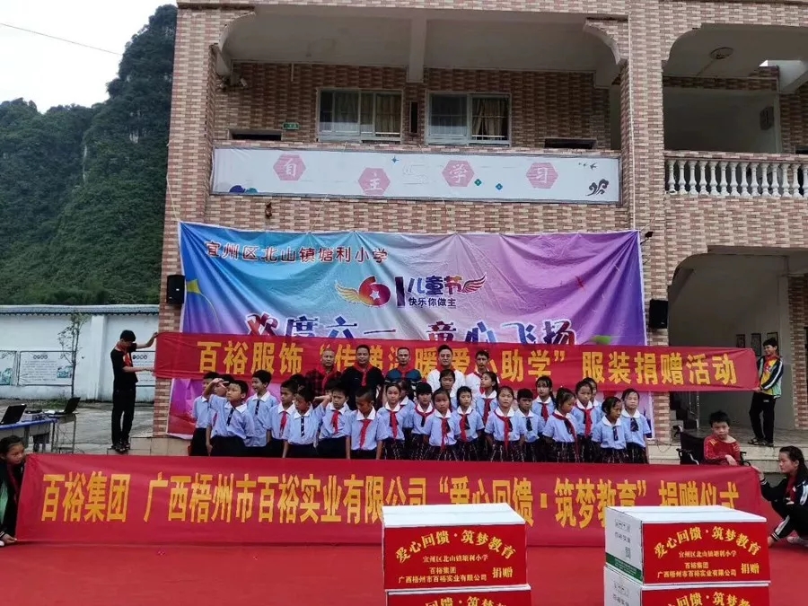 百裕集團(tuán)服務(wù)河池地區(qū)已有6年多,多年來開展了一系列的捐贈助學(xué)的公益活動。時值六一兒童節(jié),百裕集團(tuán)不忘初心,兌現(xiàn)“為環(huán)江村屯學(xué)校捐贈1106套愛心校服”承諾,并增加圖書等物資捐贈,在總經(jīng)理林志煌的帶領(lǐng)下,先后走進(jìn)環(huán)江縣10個鄉(xiāng)14個村級小學(xué),惠及1106名小朋友,為孩子們送上節(jié)日的祝福。